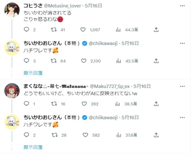 不過在發布這起事件的推文底下,卻有幾位打抱不平的網友表示:「ちいかわ不見了,這真的要生氣」、「雖然不重要,但ちいかわ在AI顯示不出來w」