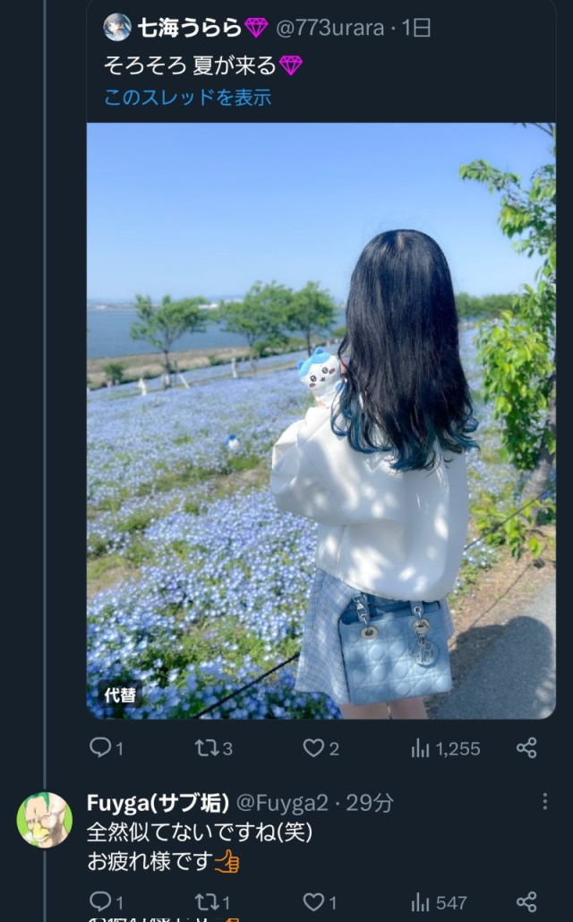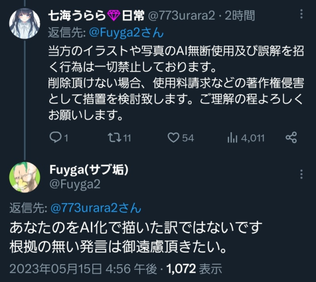 被盜圖的推主七海うらら是隸屬於avex的網路歌手,肖像權受到侵害當然馬上向對方提出警告,要求刪除。只是沒想到對方竟然反過來指控:「不可能拿你來AI作畫。請不要作毫無根據的發言。」