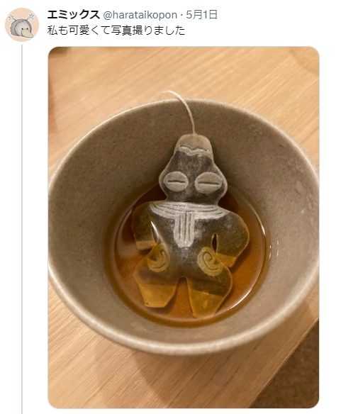 當茶包被放入杯中之後,看起來就像是土偶正在泡溫泉一樣,不少網友都表示「好可愛」、「這就是sense的具現化嗎」、「我也想要」等等,更有人覺得這可愛的畫面看起來相當溫馨(?)。