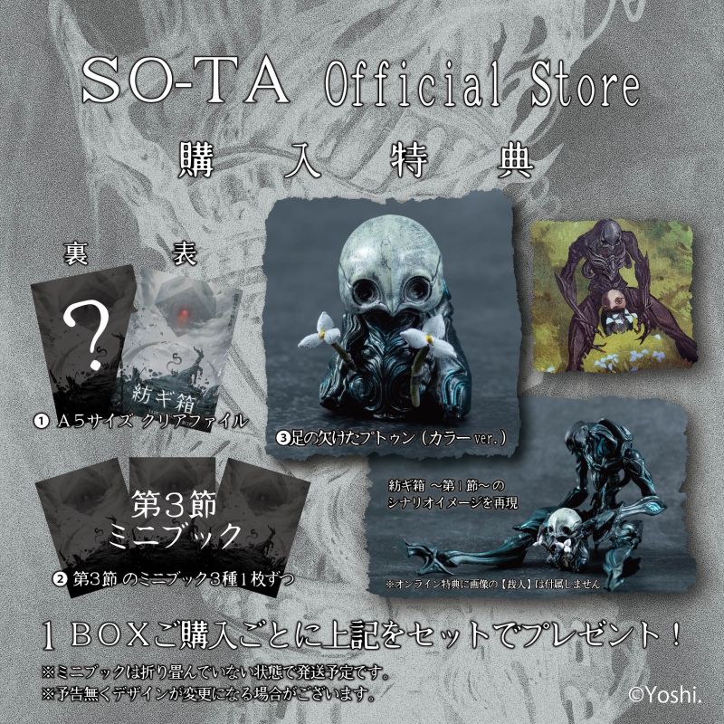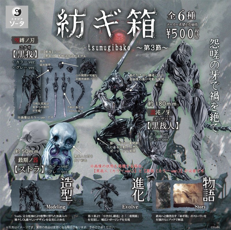 「SO-TA 紡ギ箱~第3節~」可動轉蛋,由原型師 Yoshi 完全監修,還原怪誕細節與造型之美,將角色魅力完全發揮!本彈收錄有混沌之牙【黑裁人】、武裝呪縛之刃【黑我】,以及最後之器【斯托拉】三種款式,並各有彩色ver./線墨ver.兩種配色。更加壯大紡ギ箱的世界觀!