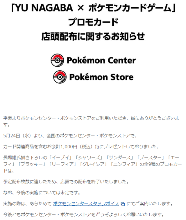 根據活動內容,只要消費 PTCG 相關商品滿 1000 日圓,就會贈送由長場雄繪師繪製的包含伊布與其八種進化型態的卡牌,共計九種,由於每間店都有限量名額,使得店家不得不實施號碼牌管控入店來面對想要的人潮。