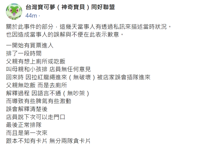 不過根據後續 Facebook 粉專「台灣寶可夢同好聯盟」與當事人取得聯繫,表示其實當天的確父親是去上廁所,請媽媽與孩子繼續排隊,店員無任何意見。不過回來時因為拉起紅龍繩,被誤會是插隊進入,但因為解釋語言不通的緣故,情緒有點激動,解釋完畢店員表示下次可以走門口,後續正常排隊。其實也是第一次來,並沒有貪圖卡片領多的想法。