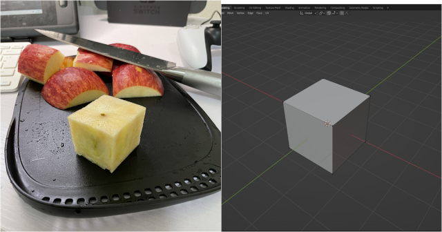 不過接下來這位名叫あさたらば(@asataraba)的Twitter網友可就聰明了,根據他的推文內容所說,圖片的這顆蘋果,是他第一天學習3D建模的第一件練習作業,但也或許是因為這對他來說有那麼一點難度,又或者是...只是想要惡搞,不管理由是什麼,他最後是決定......把蘋果切成跟初始建模一樣的正方體。