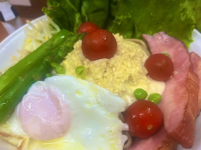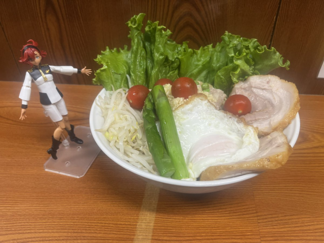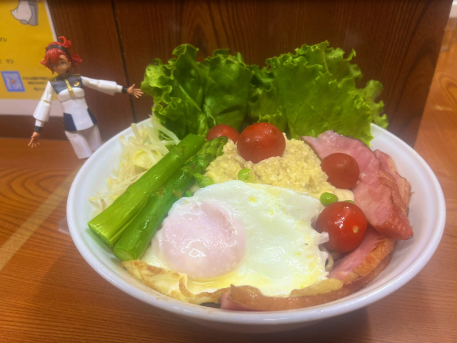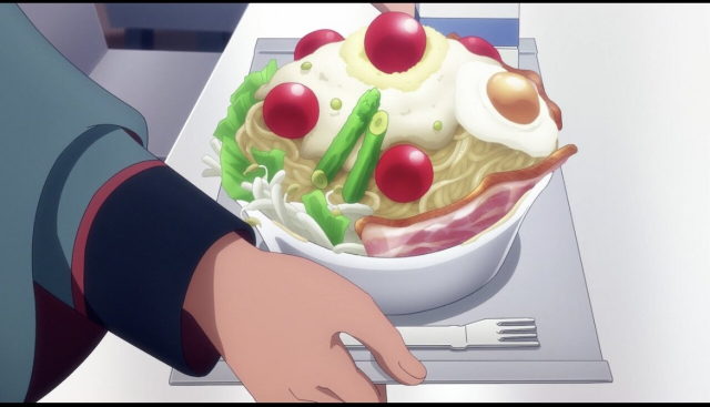 動畫中蘇萊塔在餐廳用餐的餐點,這看起來像是荷包蛋、美乃滋與多種蔬菜與培根肉片搭配麵條的組合,其實當初播出就引起不少網友討論說「這到底是什麼 ? 」,沒想到直接有拉麵店嘗試還原 XD。