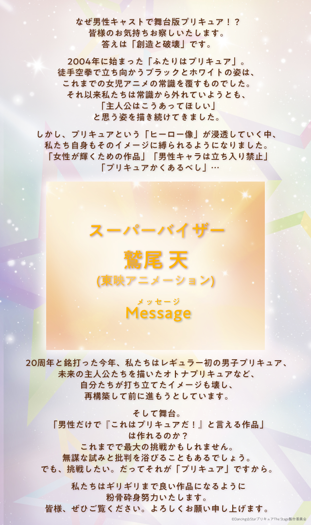 而舞台劇作為監督角色的《光之美少女》系列初代節目製作人―鷲尾天,表示這次想要由男性作為光美主角的理由是「創造與破壞」,希望打破系列作既定的印象,既使是男性也能展現出光之美少女的耀眼光芒。