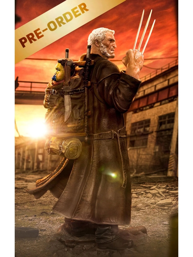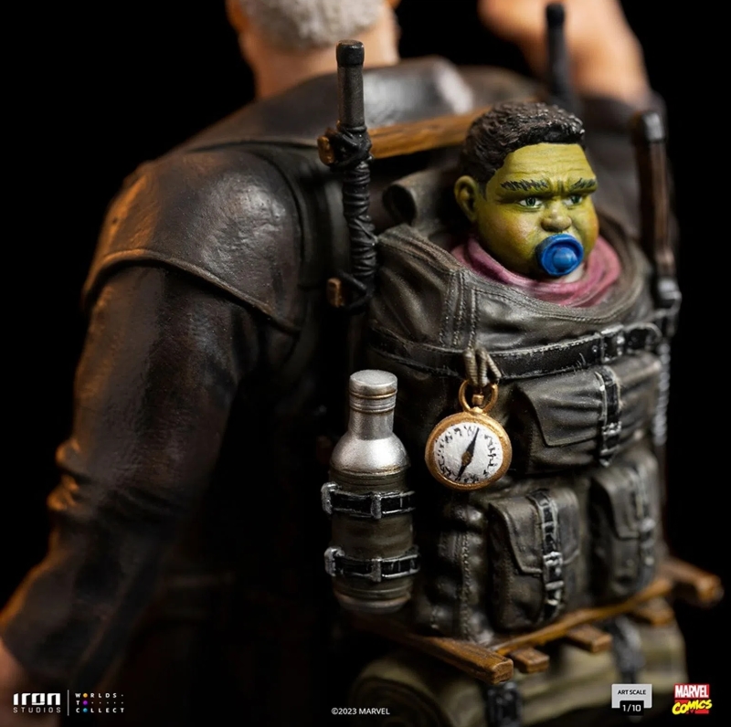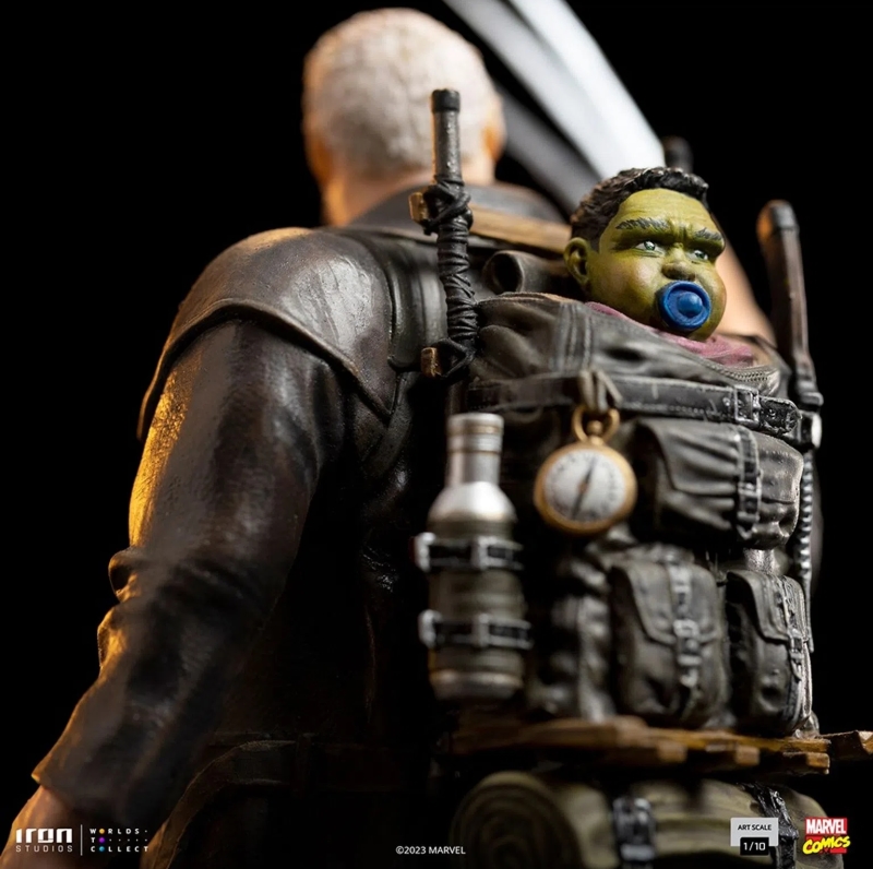 本次以 23 公分高度立體化的「老人羅根」雕像,充分再現了羅根歷經滄桑的年邁樣貌,可即使頭髮、鬍鬚都已經花白,羅根的雙眼依舊射出銳利的光芒,凝視著前方的眼神、久違地高舉伸出來的鋼爪,表現出羅根重拾金鋼狼英雄身份的狀態;從白色上衣、牛仔褲、長版皮大衣,到牛仔帽都形塑出逼真的皺褶紋理與寫實舊化,深刻傳達出故事裡極重的末日氛圍,身後的背包還裝著小小的浩克嬰兒,雖然嘴裡吸著奶嘴但實在不會用可愛去形容他!不過羅根的帥氣魅力實在無法擋。