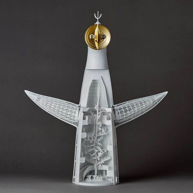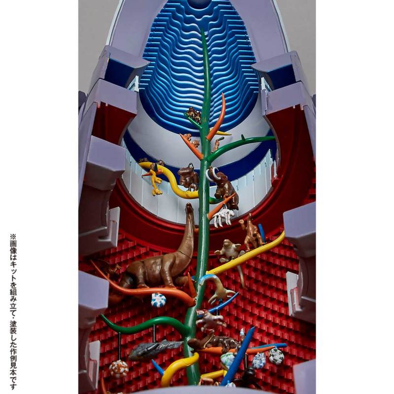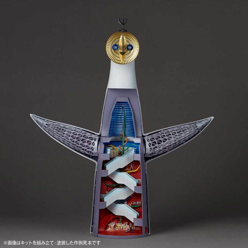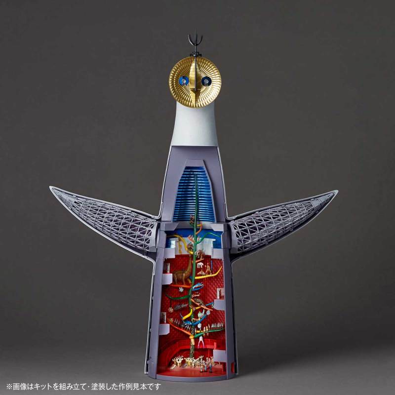 這款海洋堂推出的ARTPLA太陽之塔組裝模型,以1/200比例還原,高度來到36公分,將太陽之塔的外型,包含背面的圖案,完美地再次還原出來,就連內部展示空間所擺放的重要作品「生命之樹」,在樹上的各種生物、以及建築物本身的兩側結構,也都一一以分件還原出來,玩家可以將太陽之塔以猶如剖面的方式進行展示。塔頂端象徵未來的金色臉部,則是以金色分件特別呈現。