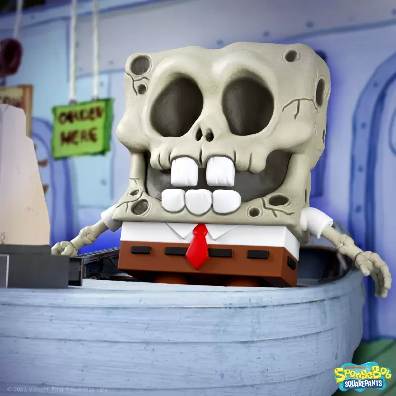 「ULTMATES! 海綿寶寶 骷髏頭」可動人偶,以單元《小刺傷》為靈感,將海綿寶寶被木刺刺中手指,為了咬出小木刺不小心把海綿皮都拔掉的搞笑骷髏造型立體化。尺寸約 7 吋的規格製作,尺寸全高約 18 公分,以逼真的塗裝還原骨骼的質感,詭異的海綿洞與骨頭裂痕也有仔細的刻劃;附屬的零件有刺著木刺的手、手指嚴重腫脹、膿汁準備噴發的誇張手勢,以及骷髏造型的左右替換手~