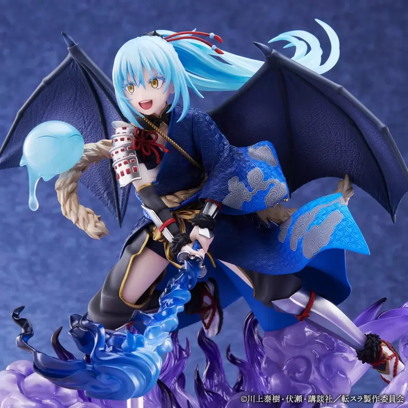 「[曉想] 利姆路・坦派斯特」1/7比例模型,尺寸全高約 21 公分,將 iDELiTE 原創的武士風格衣裝立體化,將圍繞著黑炎、躍動揮劍的威嚴姿態透過精心的造型表現出來。和服混合了盔甲的特色服飾,刻劃出不同材質的紋理並施以質感的塗裝;雙翼更是製作粗糙的皮質感,展現生動的生物感。利姆路神采奕奕的表情,在戰鬥中顯得輕鬆自如~透明材質打造的史萊姆更是畫龍點睛!