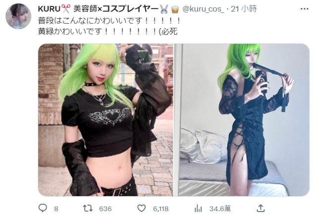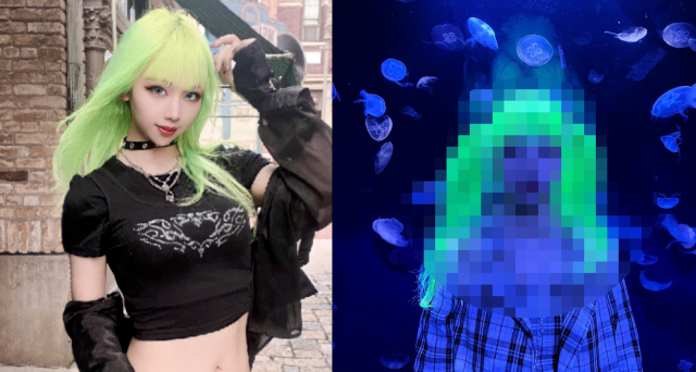 在這些人裡頭,美髮師們當然身先士卒拿自己做實驗,有位美容師推主KURU(@kuru_cos_)平常染了一頭俏麗的螢光黃綠髮,非常亮眼。不過,那天她去水族館玩的時候卻悲劇了──