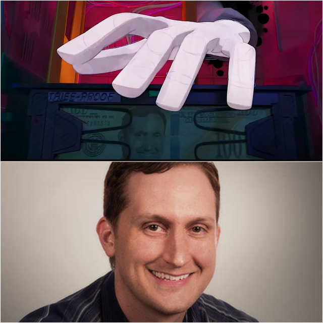 斑點人在搶劫ATM的時候,可以發現這個宇宙的美金印的不是富蘭克林,而是索尼影業動畫總監 Alan Hawkins!