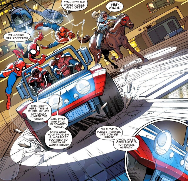 蜘蛛聯盟裡有一台蜘蛛人造型的「蜘蛛車」彼得停車 ( "Spider-Mobile" Peter Parkedcar) 是來自53931宇宙,是一個很像《汽車總動員》(Cars) 電影的世界,住著一群具有自我意識的交通工具。而在漫畫中不少蜘蛛宇宙大事件中,蜘蛛車 都有登場。