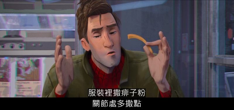 關和邁爾斯說「蜘蛛人2099」米蓋爾是「善良的吸血鬼」,邁爾斯說他願意付錢去看看,這句台詞吐槽了蜘蛛宇宙失敗作之一的《魔比斯》。