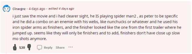 不過這麼小的畫面,是要怎麼肯定這就是《漫威蜘蛛人2》呢?搞不好這是第一款前作《漫威蜘蛛人》(Marvel's Spider-Man) 嘛!但這個部分,不僅是去看過電影的歐美觀眾證實了,就連電玩開發商Insomniac Games社區經理James Stevenson也表示,在電影中所出現的遊戲畫面,不僅是出自於《漫威蜘蛛人2》,而且還是目前為止尚未公開的操作。