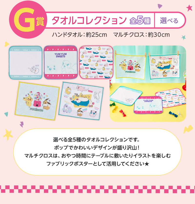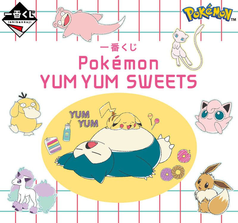 「一番賞 寶可夢 YUM YUM SWEETS 」,延續 SWEETS 系列,以繽紛活潑的糖果甜點為主題,推出 A ~ H 獎 + Last One獎、雙重中獎機會等不同級別的豐富獎品~A獎「皮卡丘布偶」與 B獎「呆呆獸布偶」,尺寸達 25 公分,坐在糖果圓墊上的造型超級可愛!另外還有 C獎「多功能置物盤」、D獎「地毯」、E獎「餐具」、F獎「收納盒」、G獎「毛巾」、H獎「壓克力吊飾」,以及Last One獎/雙重中獎機會的「伊布布偶」,讓寶可夢陪你甜萌過初夏~♪