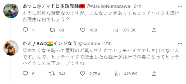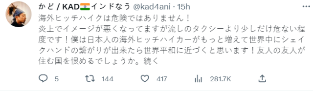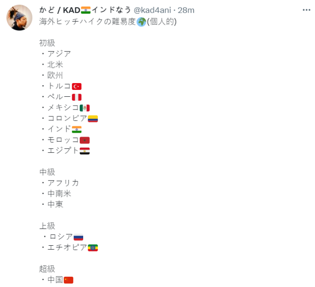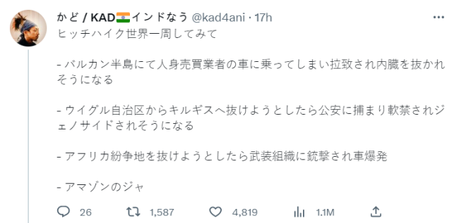 近日有位日本「搭便車環遊世界」的狂人かど / KAD ( @kad4ani ) 透過「搭便車」 的方式在世界旅行,將自己的際遇分享到推特上,讓人驚訝又駭人的遭遇引起網友熱議。