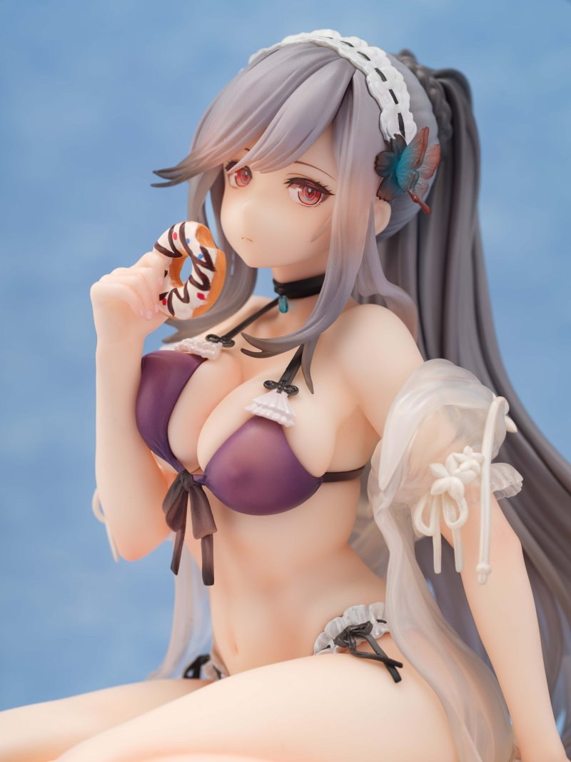 本作將 SKIN「甜蜜夏日」當中的元素充分還原,並以 15 公分的高度立體化,包含拿著甜甜圈的敦克爾克本體、頗具存在感的草帽、防曬乳、夾腳拖,以及翻開的書籍......等,除了眼神的描繪下足功夫之外,在部分長髮與薄紗外套還採用透明材料製作,原畫的動作在模型化之後可說是更為誘人,各處透出紅潤感的白皙肌膚、因為手臂擠壓而變形的右胸,比基尼若隱若現的透明感跟邪惡的突起都讓人實在按耐不住拿出魔法小卡立馬下單的衝動!