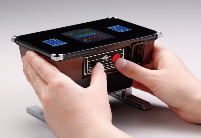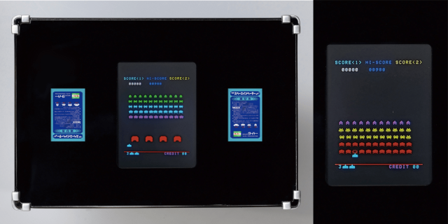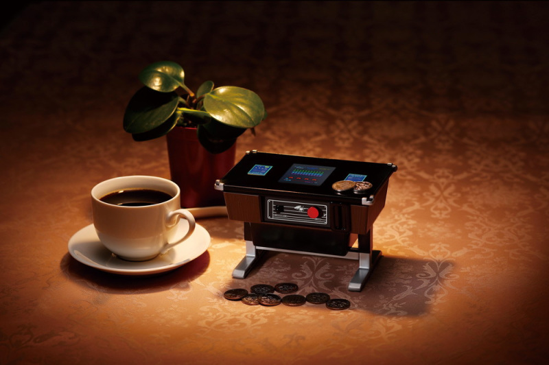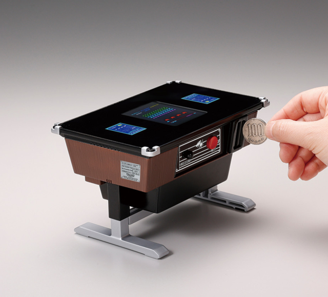 這次推出「可以玩的存錢筒」,本體像是一個桌子一般,上頭有著螢幕可以遊玩經典的《太空侵略者》,底下就如遊戲機台般可以投入硬幣存錢,