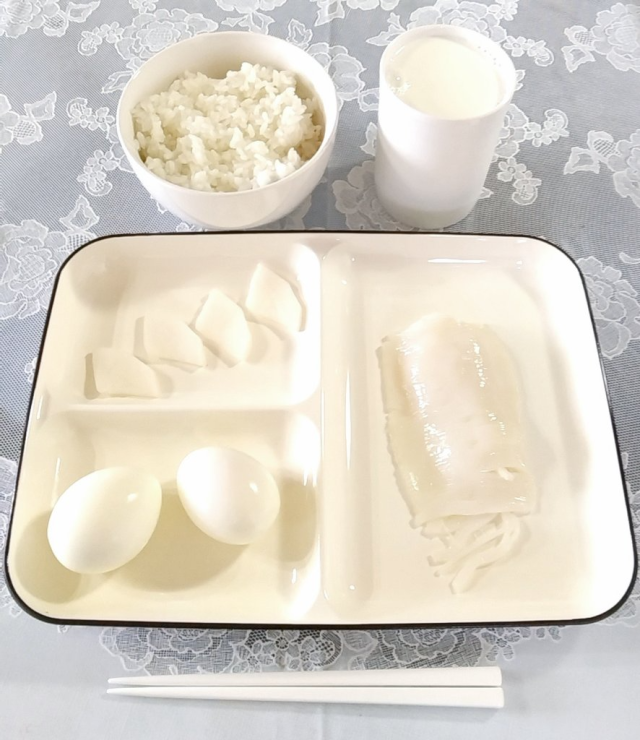 ▼有白飯、烏賊生魚片、醃白蘿蔔、水煮蛋和牛奶,餐具除了餐盤的邊框以外都是白色。