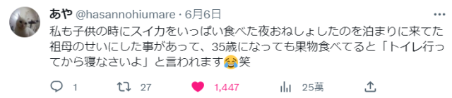 ▼「我小時候吃太多西瓜結果晚上尿床,然後還怪到祖母頭上。現在就算35歲了一吃水果還是會被說『記得要先去廁所再睡喔』笑」