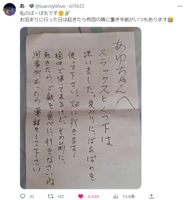 ▼「我的阿嬤也是。去留宿的時候隔天早上醒來床旁邊都會放一張信」