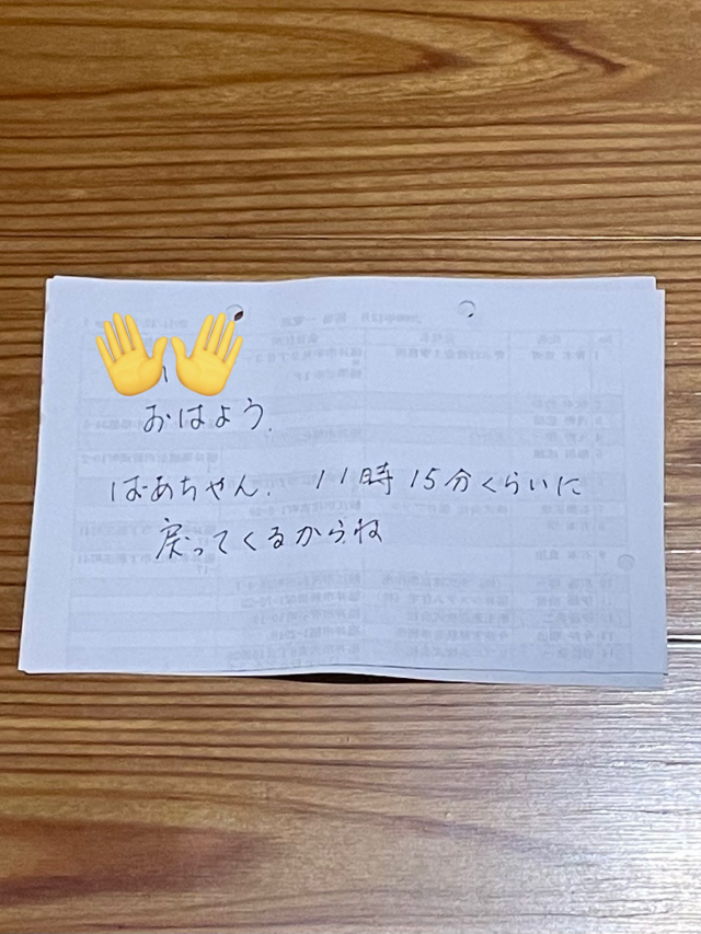 奶奶:「OO早安,奶奶大概11點15分就會回來喔」