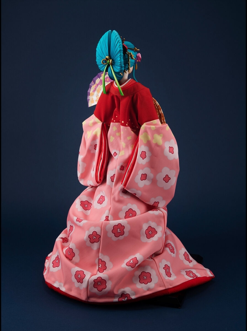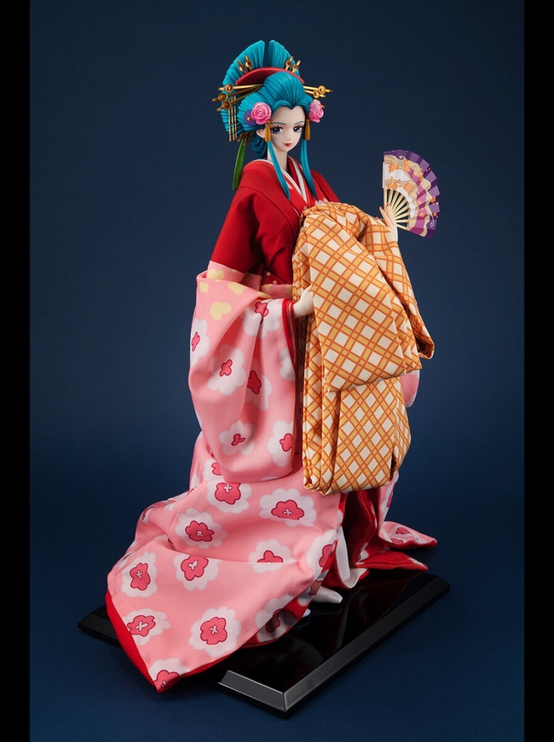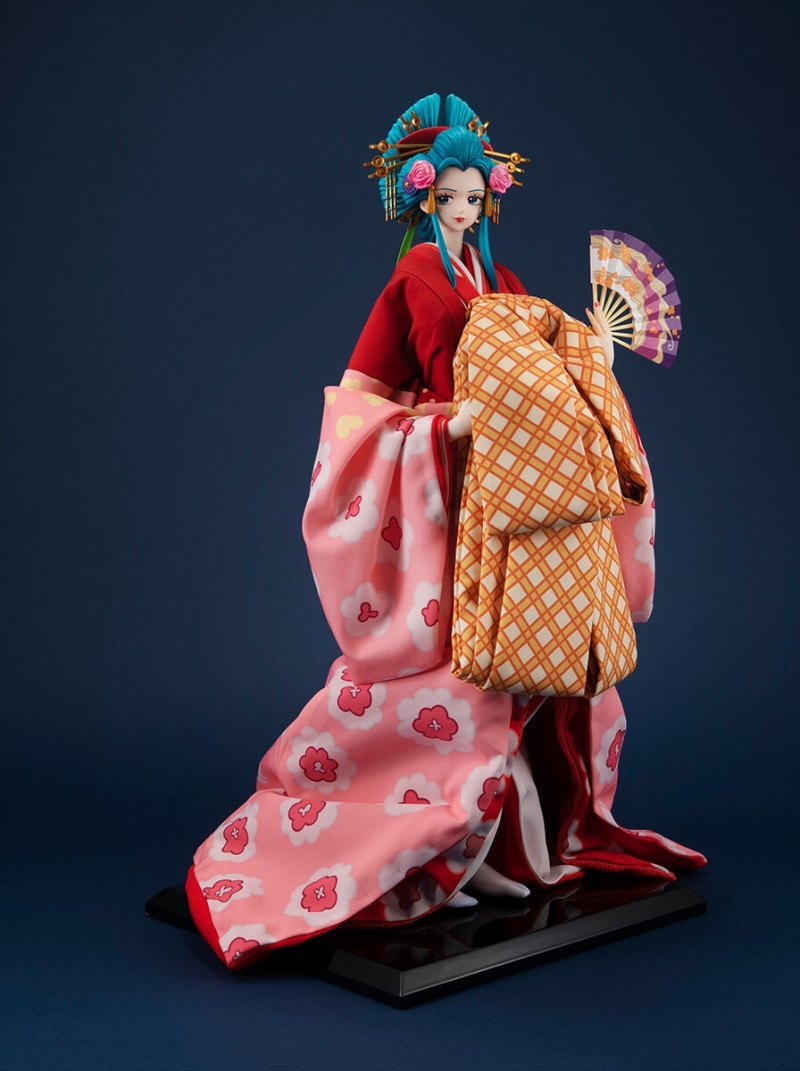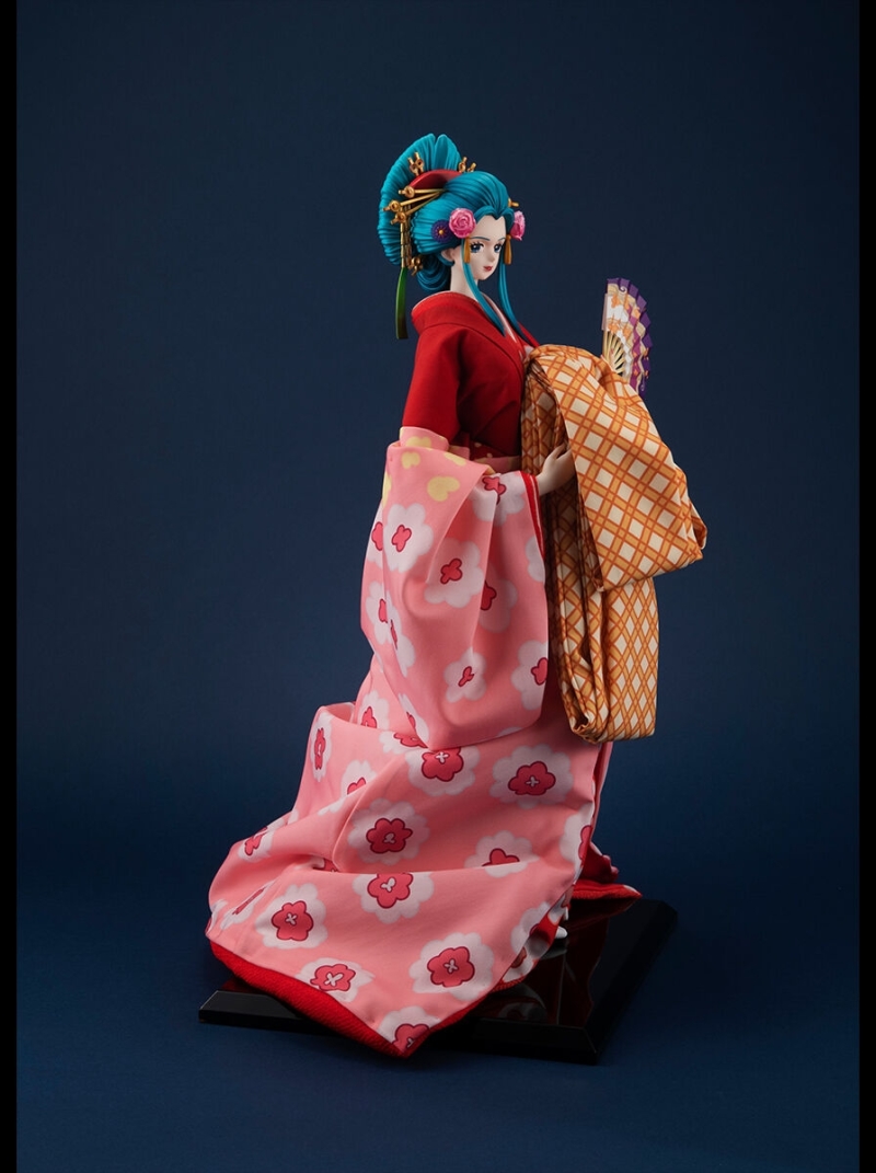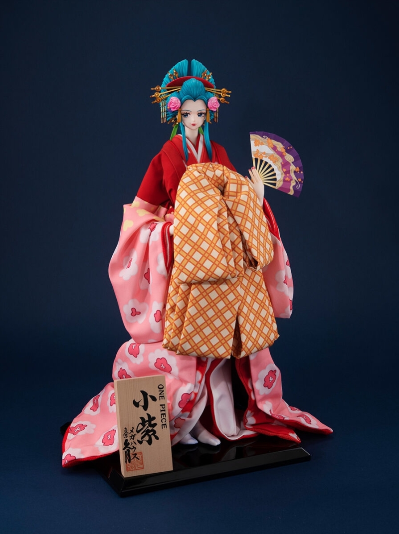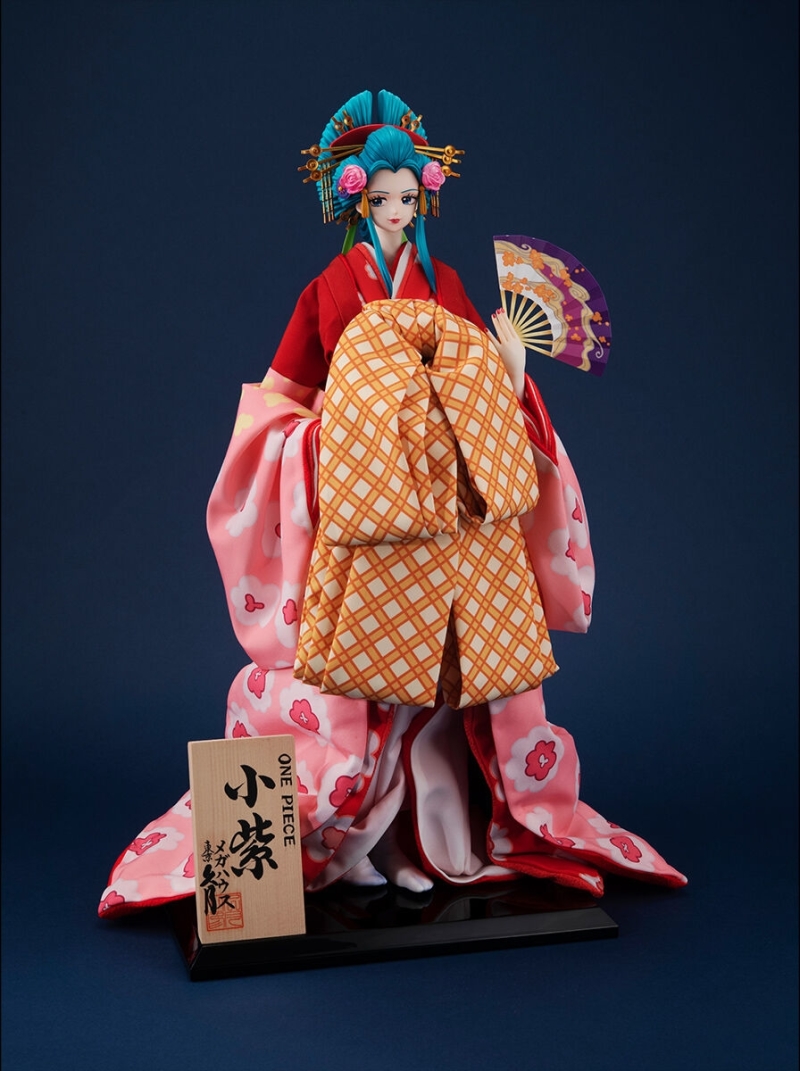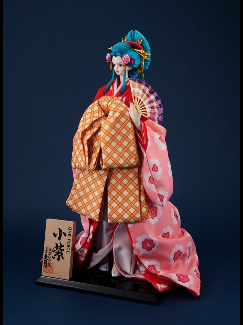 本次依照《航海王》動畫「和之國」篇章為題,結合 MEGAHOUSE 立體人形製作技術與久月打造日本人形的傳統工藝,將劇中擁有傾國傾城美貌的花魁「小紫」絕美立體化!全高來到 55 公分(含底座),不僅將小紫的白皙肌膚、纖細軀體,標緻臉蛋充分還原,藍色長髮與華麗的金色髮飾也十分細緻,和服則是依循久月的工藝技術手工縫製,扇子的圖案也非常考究,整體極具存在感的尺寸、和服布料自然垂墜的質感,加上人形旁邊寫有「小紫」的木製名牌,營造出豐沛的高級感。