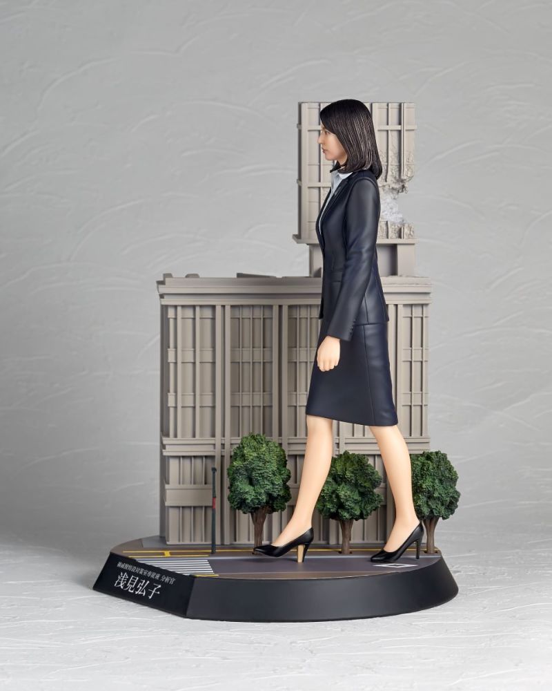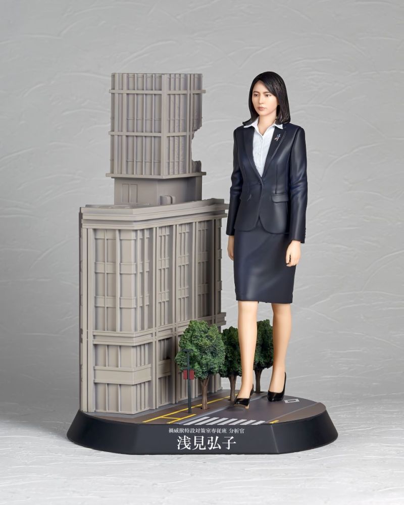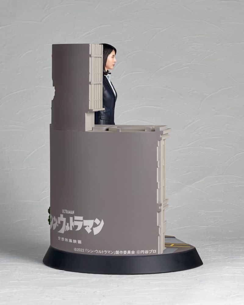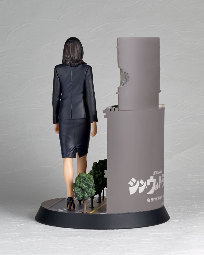 這次由海洋堂原型師「村井太郎」擔任原型製作的場景模型採用 PU、Polystone 為材料製作,全高來到 23 公分,不僅打造出淺見弘子的 OL 裝扮、彷彿陷入被催眠狀態的無神面容,更以周圍的大樓建築、迷你的行道樹傳達出淺見弘子的魄力尺寸!從側面欣賞能感受到正在行走的動態感,大樓遭到淺見弘子肘擊破壞之後的痕跡也考究還原,大樓建築背面還對應了圓形底座做出了圓潤的線條,並印製了《新·超人力霸王》、「空想特撮映画」的 LOGO,加上位於底座正面的「禍威獸特設對策室專從班 分析官」職稱,整體非常讚。