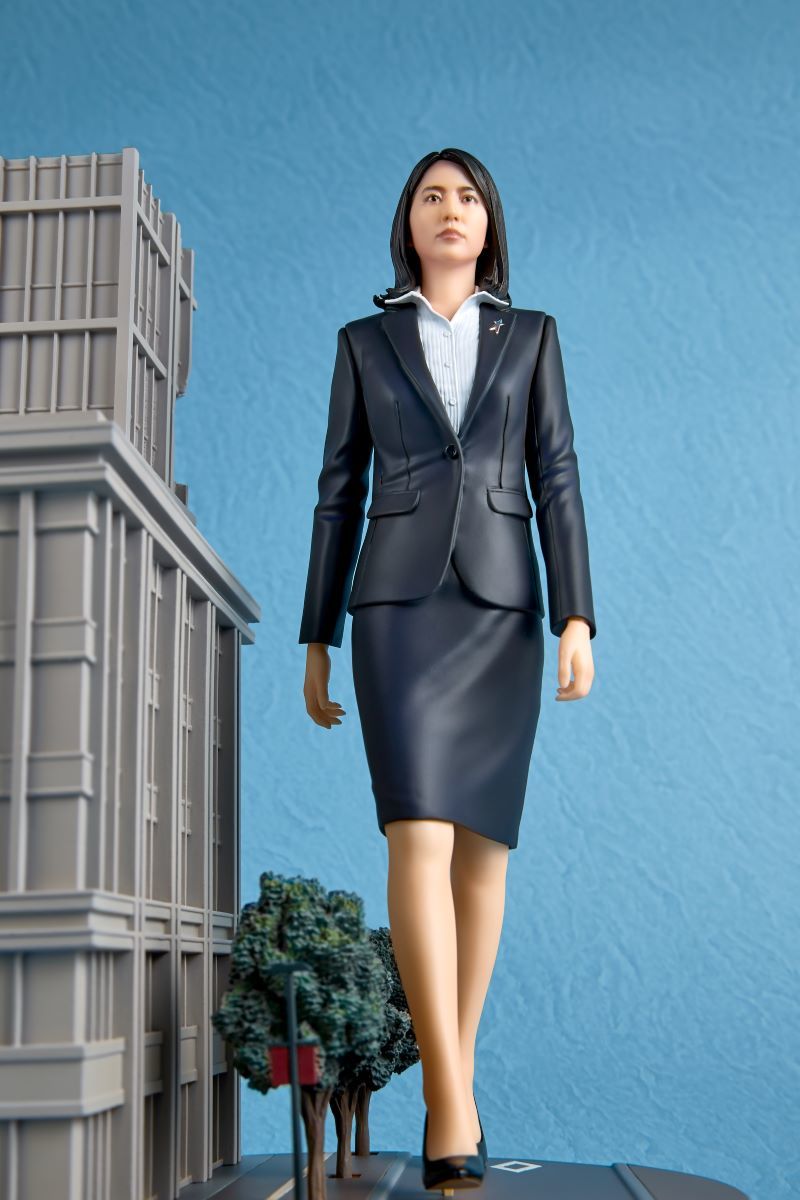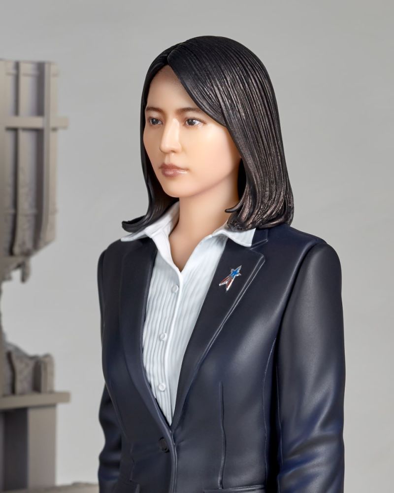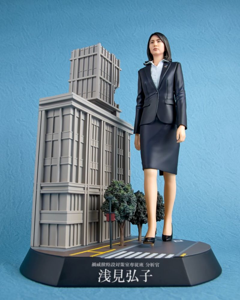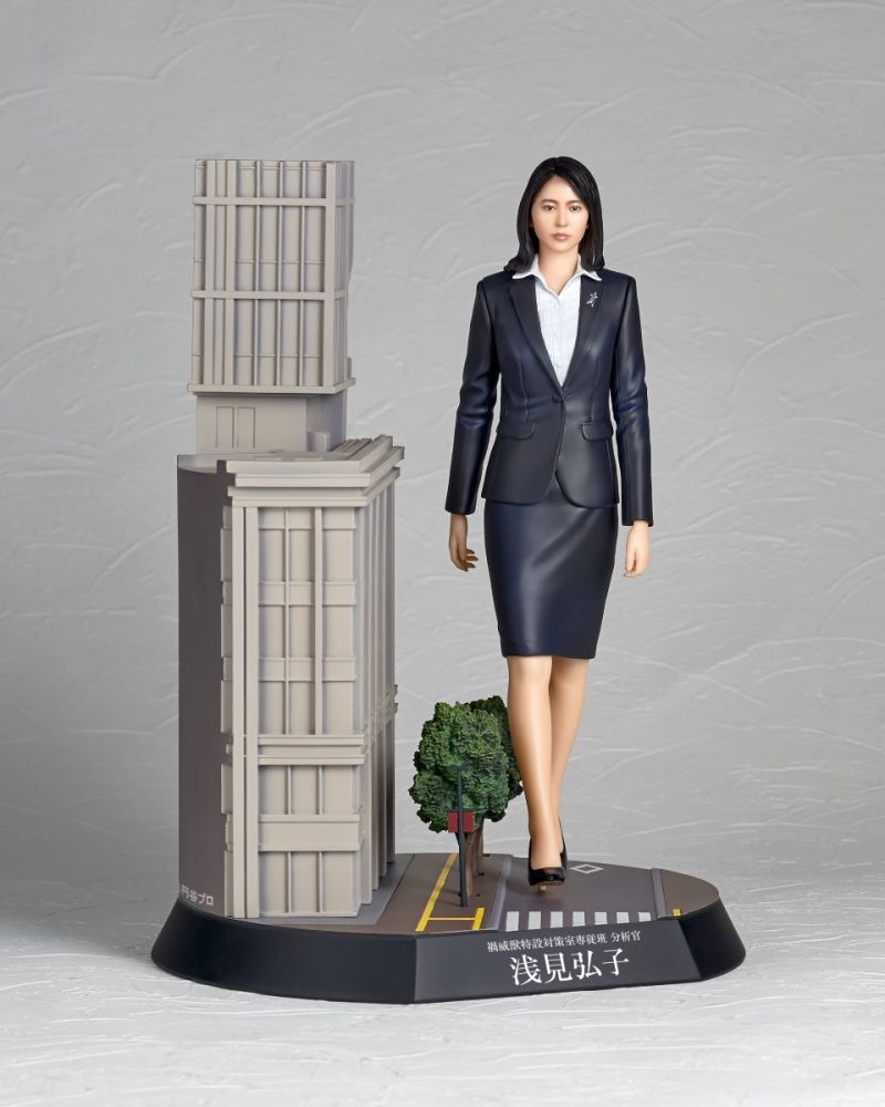 這次由海洋堂原型師「村井太郎」擔任原型製作的場景模型採用 PU、Polystone 為材料製作,全高來到 23 公分,不僅打造出淺見弘子的 OL 裝扮、彷彿陷入被催眠狀態的無神面容,更以周圍的大樓建築、迷你的行道樹傳達出淺見弘子的魄力尺寸!從側面欣賞能感受到正在行走的動態感,大樓遭到淺見弘子肘擊破壞之後的痕跡也考究還原,大樓建築背面還對應了圓形底座做出了圓潤的線條,並印製了《新·超人力霸王》、「空想特撮映画」的 LOGO,加上位於底座正面的「禍威獸特設對策室專從班 分析官」職稱,整體非常讚。