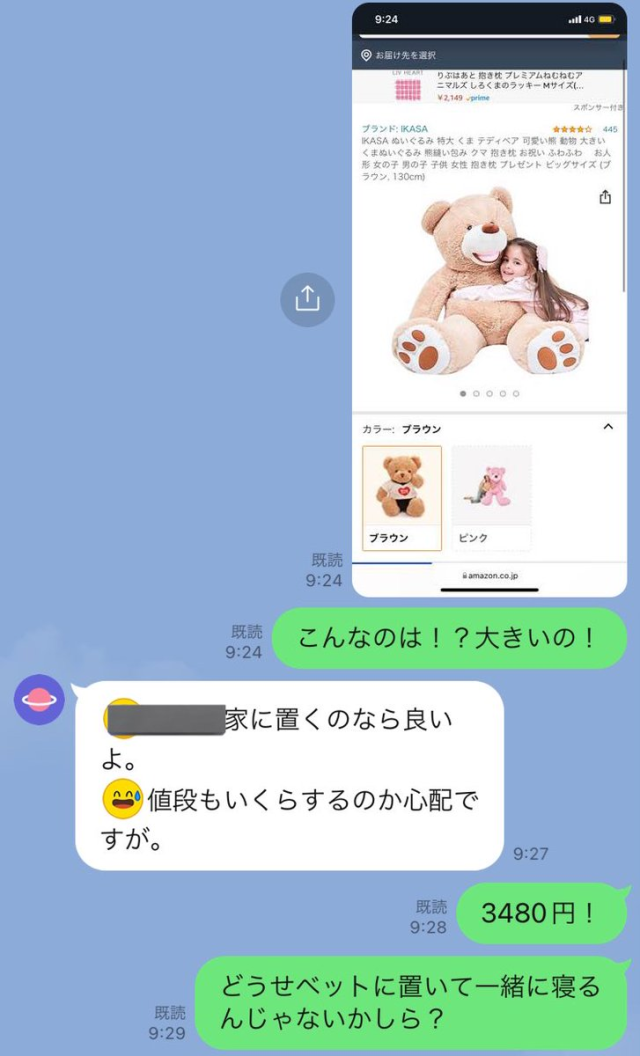 實際的「巨大絨毛熊熊」大概是長這樣,看起來十分可愛,大小應該也超過 100 公分以上,以推主爸爸購買的 3,480 日圓來說其實滿便宜的,確定送達時間後推主也滿心期待收到貨品。