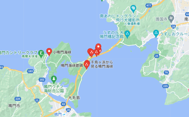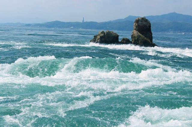 ▼鳴門海峽連接右上方的淡路島與四國,因為瀨戶內海和紀伊水道之間漲退潮的關係,有著非常壯觀的風景「鳴門漩渦」