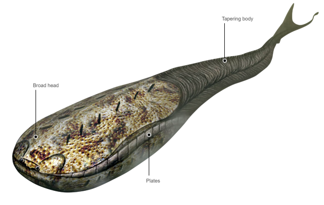 實際上這隻魚的名字叫作Sacabambaspis,也就是「薩卡班甲魚」(サカバンバスピス,用日文寫起來會特別可愛XD),是生存在四億七千萬年前的一種古生物魚類,頭部有鱗片包覆,然後因為那時的脊椎動物尚未演化出下巴,所以臉才會這樣扁扁的。