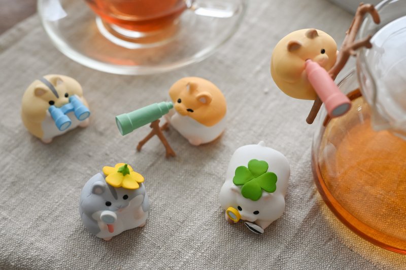 本次的「Animal Attraction 零食探險隊!麻糬哈姆鼠」轉蛋,每款尺寸約為 38-43mm,讓圓萌如麻糬一樣軟綿綿的哈姆鼠化為探險小隊,對零時展開詳細的調查研究!分別有:爬梯子哈姆、放大鏡哈姆、雙眼鏡哈姆、望遠鏡哈姆和吃零食哈姆,一共五位研究員。他們利用小花或小葉子作為偽裝,雪亮的小眼睛認真地觀察各種好吃的零食...展現崇高的研究精神!
