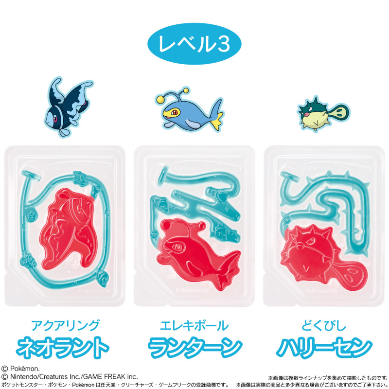 讓人能邊吃邊玩、享受釣魚樂趣的「寶可夢釣魚造型軟糖」,以來自日本的風味軟糖為主體,並設計成一長條彎彎曲曲的軟糖,分為藍色汽水口味釣線、蘋果口味的寶可夢造型,總共有三種難易度,難度一的有:鯉魚王、鐵炮魚,接著難度二的有:蚊香蝌蚪、 利牙魚、海星星,以及難度三的:霓虹魚、電燈怪、千針魚、超帥的暴鯉龍、古空棘魚和毒刺水母,一款隱藏版等 12 種人水系寶可夢!快來挑戰吧~