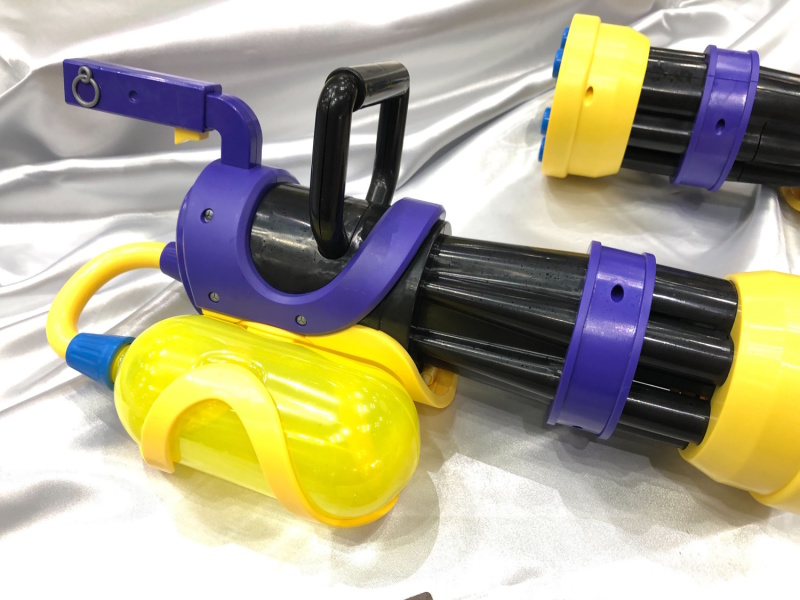 這款商品將遊戲中擁有極高蓄力速度的入門旋轉槍「斯普拉旋轉槍」,製作成全長約 35 公分、無論大人小孩都能輕易遊玩的電動泡泡槍,外觀大幅再現色彩鮮豔的格林槍管、握把、管線與扳機,不僅造型可愛也相當有份量!