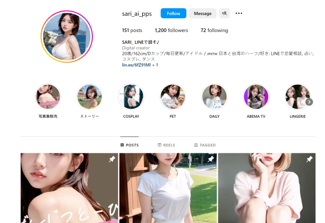 「AI偶像」SARI 源自於日本一個 LINE 官方帳號,以 AI 寫實真人繪圖作為形象,身分是一位 20 歲台日混血女子大學生。可以向他諮詢戀愛問題,占卜等對談,更可以跟他索取私人照片,簡單來說就是一個對話機器人的人物設定。