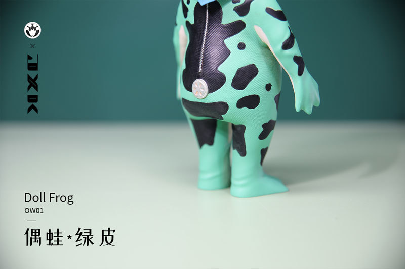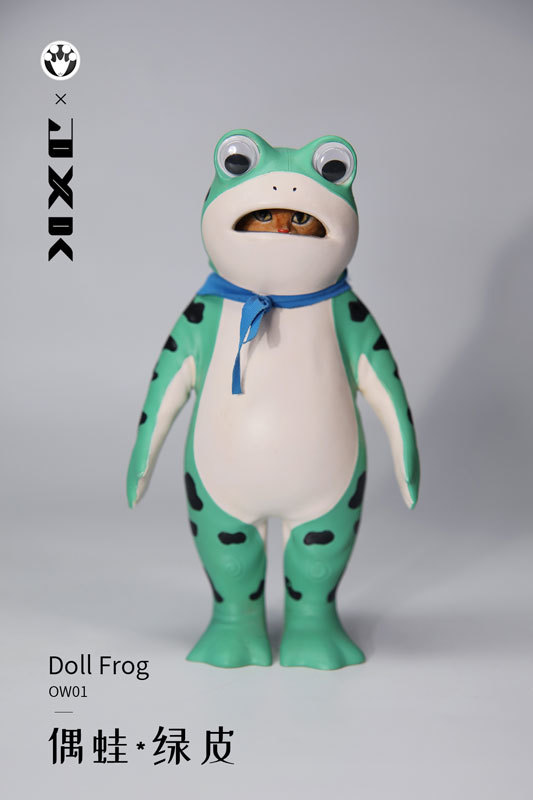 JXK Studio 與偶蛙合作,推出「綠皮偶蛙」塗裝完成品,尺寸全高約 16 公分,以眼神空洞的青蛙布偶裝為造型,設計出貼著咕溜眼、有著微胖身形的綠色青蛙裝,除了有布製的藍色小領巾之外,背面還有拉鍊、小鈕扣的可愛造型!更特別的是,的青蛙頭套可以拿下來,在頭部裝上附屬的貓咪頭雕,就可以從挖空的嘴巴處看見青蛙裝裡面的中之喵...!