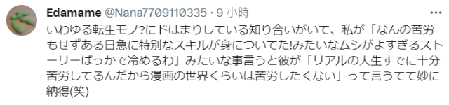 ▼有網友說自己的朋友很愛轉生系的題材,他覺得「不為什麼就獲得特別技能!這樣的情節一大堆,一下就冷掉了」對方卻說:「因為現實世界已經很辛苦了,不想連漫畫的世界都一樣辛勞。」