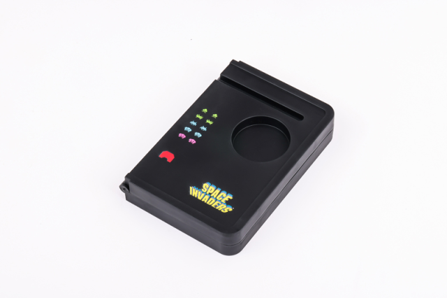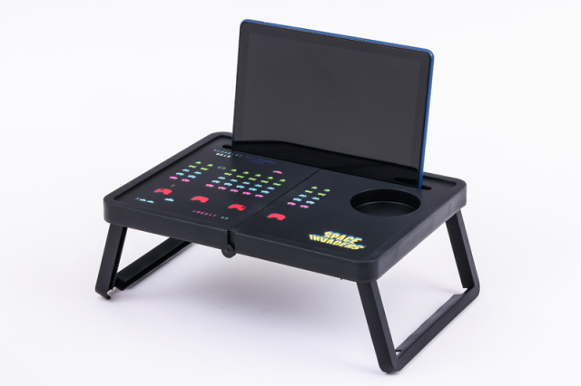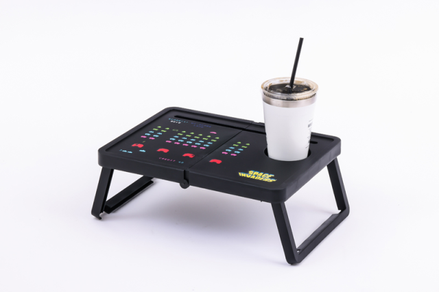 這個摺疊桌桌面非常簡單,就是《太空侵略者》的遊戲畫面,且桌緣有凹槽可放置平板或手機,右上角的圓形凹槽還能放置飲料,且桌面大小為33.5cm×25cm,放置筆記型電腦也沒問題,當不使用的時候只要對摺起來就可以輕鬆收納。