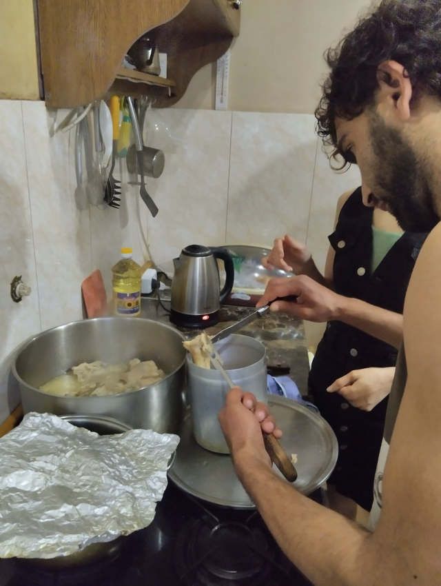 因為拉麵最重要的就是高湯,推主使用了從冰庫拿出的大量豬腳與雞骨來燉煮,或許燉在鍋裡四分五裂的,外國友人見狀表達困惑的心情,畢竟這樣的烹飪方式似乎在喬治亞當地是很罕見的,似乎也能體會。