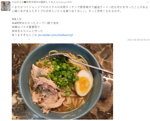 雖說遭到質疑,後續大家還是幫忙他料理,最後也成功煮出豚骨雞湯的醬油拉麵,一次煮了八人份,花了四個半小時煮出湯頭,喬治亞的友人也對他的廚藝大為讚賞,看來透過美食的國民外交非常成功 XD。