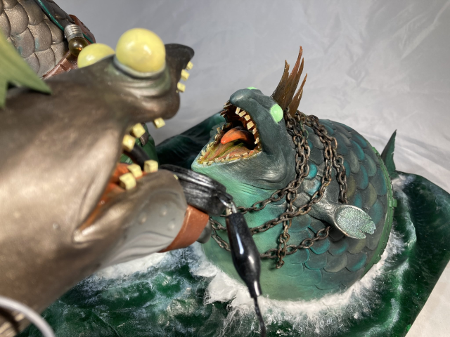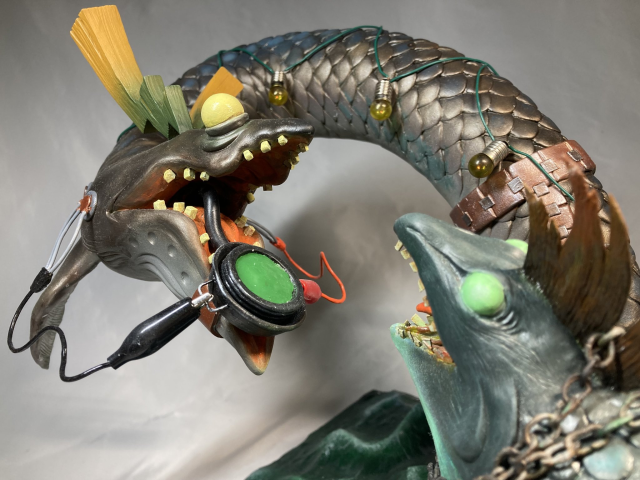黏土人偶作家ものづくりのてるづき(@teruzuki_mono)就以登場於《斯普拉遁3》的頭目鮭魚「橫綱」與「辰龍」為主角,利用黏土做出了兩隻頭目互相對峙打架的場景,兩隻的兇猛神情和場景的魄力簡直不像是「闔家歡」遊戲會登場的怪獸啊!
