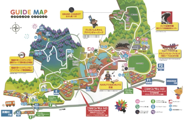 「二次元之森」(ニジゲンノモリ)位在瀨戶內海上最大的島嶼・淡路島,淡路島北部的丘陵地上還有著一座「兵庫県立淡路島公園」,包含 : 《蠟筆小新》、《火影忍者》、《勇者鬥惡龍》與《哥吉拉》都可以在這裡看到相關設施,也會有期間限定的 IP 合作 ( 近期宣布的是《城市獵人》),是不少動漫粉絲朝聖的好選擇。