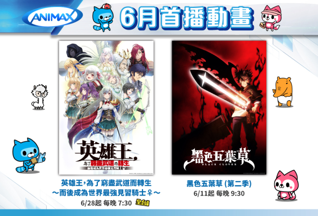 炎炎夏日來襲,就用熱血的心準備迎接夏天的到來吧!Animax頻道將於6月播出《英雄王,為 了窮盡武道而轉生~而後成為世界最強見習騎士♀~》及《黑色五葉草 (第二季)》,不管男女 老少、不管是不是英雄,都要勇於追夢,熱血戰鬥起來!