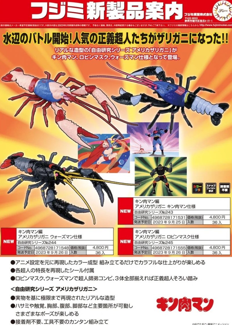 「美國螯蝦 金肉人規格」、「美國螯蝦 戰爭人規格」、「美國螯蝦 羅賓假面規格」以過去推出的人氣商品「自由研究24 生物編 美國螯蝦」為基礎製作,尺寸全長約 23 公分,零件細膩再現螯蝦甲殼上粗糙的尖刺,雙螯、第2~5胸腳、腹部、蝦尾等,擬真造型與可動機構兼具。出色的分色分件再現動畫中的配色,搭配附屬的貼紙,完成正義超人三人組!