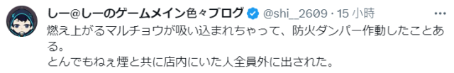 ▼「以前曾經碰過燒起來的腸子被吸進去,導致防火風門被啟動。後來店裡的人就跟一大堆煙一起被放逐到了店外。」