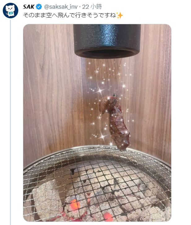 推主げっそる(@kim_kim_kimch)近日發了一則推文,說他的烤肉就是因為抽油煙機吸力太強,導致肉懸浮在半空中(?好像要被吸走了。