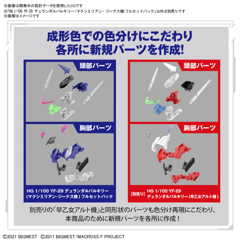 「HG 1/100 YF-29 迪朗達爾女武神(馬克西米利安·吉納斯機)超級組件套組」由先前推出的早乙女有人機修改而來,套件具備精密的分色分件,使用新規成形色再現特徵的藍白配色機身,並以新規零件再現獨特的機翼造型,各透明零件採用三種不同色彩的偏光成形色製作。能依據不同角度的光線照射變化色彩。