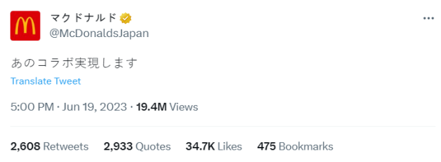 這次麥當勞的合作也大受網友好評,事實上前幾天官方推特還發布了「あのコラボ実現します 」 ,看似想要網友敲碗合作的願望,沒想到真的是跟「あの」合作,也讓不少網友表示很會 XD。