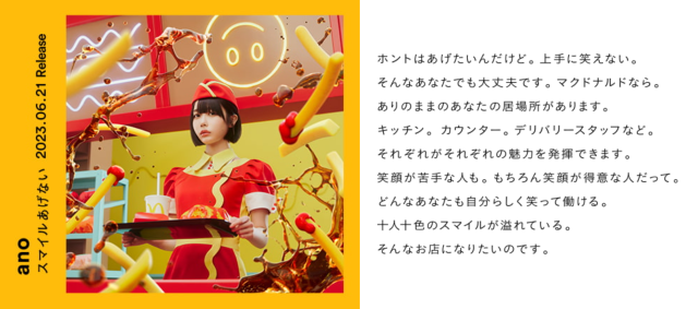 過去服務業一直以來都以向顧客微笑為最重要的原則之一,尤其餐飲業也是盡量能替顧客最周全的服務為目標。不過最近日本麥當勞反其道而行,在徵才的廣告與年輕歌手あの合作,推出了歌曲「スマイルあげない」( 不給你微笑 ),一貫中毒性高的歌聲瞬間成為網路話題,搞怪的風格擄獲不少粉絲芳心。